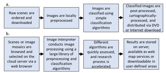 Description of two processes for conducting remote sensing. (a) Traditional approach, prior to era of cloud computing; (b) Workflow that is used during the era of cloud computing.