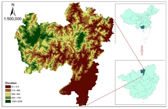 Location of the study area. Geographical Spatial Distribution of Rongshui County, Guangxi Zhuang Autonomous Region. Notes: the elevations are graded in the figure.