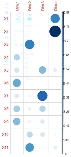 The principal component factor contribution graph. Dim1, DIM2, Dim3, and Dim4 represent four principal components. The larger circle area in the graph, the greater factor interpretation. Slope (X1), soil thickness (X2), altitude (X3), average age (X4), canopy (X5), average DBH (X6), number of plants per hectare (X7), volume per hectare (X8), average tree height (X9), ridge distance (X10), and river distance (X11).