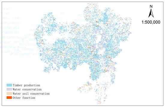 Table A3 showed the partial results of leading function division of forest resource subcompartments in Rongshui County, Guangxi. Compared the four functions of subcompartments after taking absolute value of data, and used the function with the highest score to determine the dominant utilization function of each subcompartment, the spatial distribution of each dominant function was shown in Figure 4. The confusion matrix (Table 6) was constructed based on the forest species of Rongshui County’s forest resources subcompartment and the dominant function evaluation results of the model construction. Through the confusion matrix, among the 20,754 subcompartment in the evaluation, there were 12,060 subcompartments whose dominant function was wood production (58.11%), 4511 subcompartments (21.74%) for water conservation function, 2298 subcompartments (11.07%) for water and soil conservation function, and 1885 (9.08%) for other functions. The accuracy rate of the main function evaluation model was 61%, and the wood production function was 94.2%. The recall rates of the four main functions were 62.6%, 51.6%, 37.6%, and 21.6%, respectively. The forest resource subcompartment in Rongshui County of Guangxi was mainly for timber production, which was suitable for multifunctional forest management with dominant function as the main body. According to the accuracy of the overall model and the recall rate of the leading function, the results of the evaluation model based on principal component analysis were consistent with the actual situation, and can be used to evaluate the dominant function.
