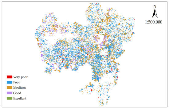 The comprehensive score of the multifunctional comprehensive evaluation model was standardized, whose range is [0,100]. According to the equidistant classification, 0–20 is extremely poor, 20–40 is poor, 40–60 is medium, 60–80 is good, 80–100 is excellent, which was divided into five grades. According to a comprehensive analysis, the number of forest resource subcompartments in Rongshui County with the grade of good and above was 9174, covering an area of 48,963.41 hm2, accounting for 44.20% and 51.24%, respectively (Table 7). The artificial forest subcompartments in the study area had multifunctional management, whose situations were at the middle and lower level. The result indicated that it is urgent to improve the multifunctional management level of small classes in the area, formulate scientific and reasonable multifunctional forestry measures, and improve the management technology of multifunctional plantations. The spatial distribution of multifunctional management level in the study area was shown in Figure 5.