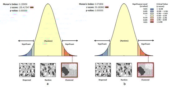 Clustering mode of multifunctional business space. (a) shows Moran index of spatial distribution of multifunctional forest management suitability, and (b) shows Moran index of spatial distribution of dominant functions in the study area.