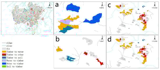 Spatial distribution of oriented functions of subcompartments. (a) indicates that the dominant function of the subcompartment is transformed from other ecological functions to wood functions, (b) indicates that the dominant functions of subcompartments are transformed from wood production functions to water and soil conservation functions, that of (c) subcompartments changes from wood production functions to water conservation functions, and (d) indicates that the dominant functions of sub-compartments transform from water conservation to wood production.
