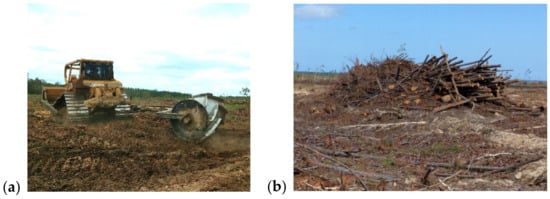 Site preparation operational activities: (a) chopper roller and (b) roadside pile after excavator manipulation prior to burning. Photos taken by Michael Berry.