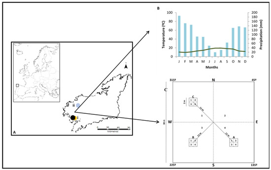 (A) Map of Europe with the situation of the province of A Coruña where the two sampling areas stand in: (i) Monte Pindo, where the black circle is the area affected by the fire and the orange circle the control zone and (ii) Brañas of Reveirugas. (B) Ombrothermic diagram of the studied area. (C) Scheme of the plot of 30 m × 30 m, the 2 m × 2 m subplots, and the 1 m × 1 m units.