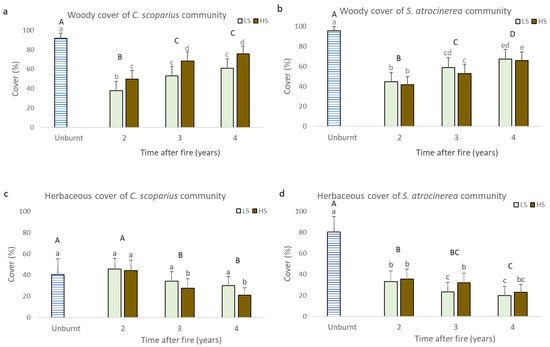 (a–d): The horizontal cover of woody and herbaceous species reached in unburnt areas and burned areas 2, 3, and 4 years after fire with different fire severity levels in C. scoparius and S. atrocinerea communities. a: woody cover of C. scoparius community, b: woody cover of S. atrocinerea community, c: herbaceous cover of C. scoparius community, d: herbaceous cover of S. atrocinerea community, HS: high severity, LS: low severity. Different lowercase letters indicate differences between severities and different uppercase letters indicate differences between unburnt and post-fire years.