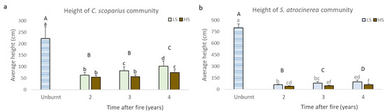 (a,b): The average height reached in unburnt areas and burned areas 2, 3, and 4 years after fire with different fire severity level in the C. scoparius and S. atrocinerea communities. a: height of C. scoparius community, b: height of S. atrocinerea community, HS: high severity, LS: low severity. Different lowercase letters indicate differences between severities and different uppercase letters indicate differences between unburnt and post-fire years.