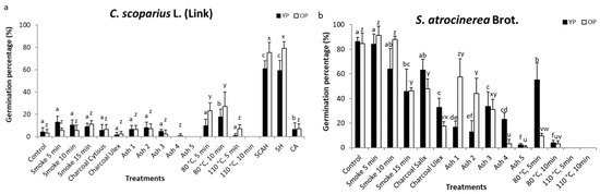 Thermal shocks of 80 °C for 5 and 10 min stimulated the germination of the seeds of C. scoparius OP. The seeds from C. scoparius YP only were stimulated to germinate with exposures to 80 °C for a period of 10 min. In addition, the combined treatments that included heat and smoke (SCAH and SH) greatly stimulated the germination of C. scoparius by multiplying the control germination of the seeds of young plants by 15 and that of mature plants by 26 [93]. It also found stimulation of germination by smoke or heat in 77% of 30 Mediterranean species [93].