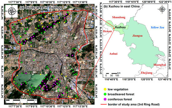 The location of the study area: (a) the border of the study area (i.e., the third ring road of Xuzhou) and the sites for field investigations (yellow for low vegetation, green for broadleaved forest, and purple for coniferous forest); (b) Xuzhou in east China.