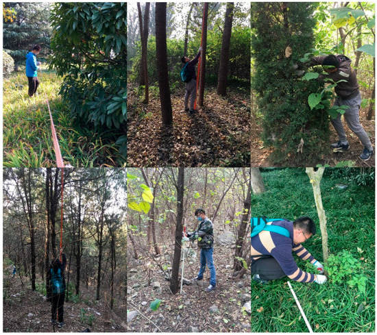 Note that our records varied with vegetation type. Within each quadrat, we documented the name, tree height (from the base to the crown), and DBH (diameter at breast height, i.e., ~1.3 m) for trees, the name, basal diameter, height, and crown width for shrubs, and the name, height, and coverage area for grass. Different measuring tools were used in accordance with the plants to be investigated and the parameters to be recorded. The DBHs and basal diameters were measured by a 2-m tape measure with a minimum scale of 1 mm while shrub heights were measured by a 5-m tape measure with a minimum scale of 1 mm. For tree heights, we used a telescopic height measuring rod with a maximum range of 20 m and a minimal scale of 1 mm. Photos illustrating the fieldwork are shown in Figure 2.