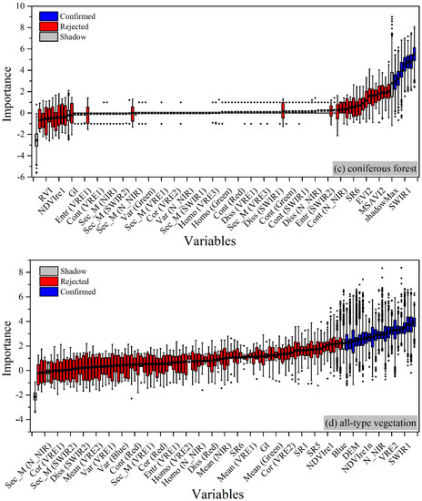 Importance of candidate variables: (a) low vegetation; (b) broadleaved forest; (c) coniferous forest; and (d) all-type vegetation. Important variables are labeled as Confirmed in blue, unimportant ones as Rejected in red, and shadow ones as Shadow in grey.