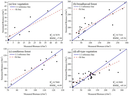 Accuracy assessment of the SR biomass estimation models: (a) low vegetation; (b) broadleaved forest; (c) coniferous forest; and (d) all-type vegetation.