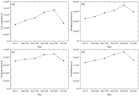 Type-specific biomass and the total vegetation biomass in the selected months of 2017: (a) low vegetation; (b) broadleaved forest; (c) coniferous forest; and (d) all vegetation.