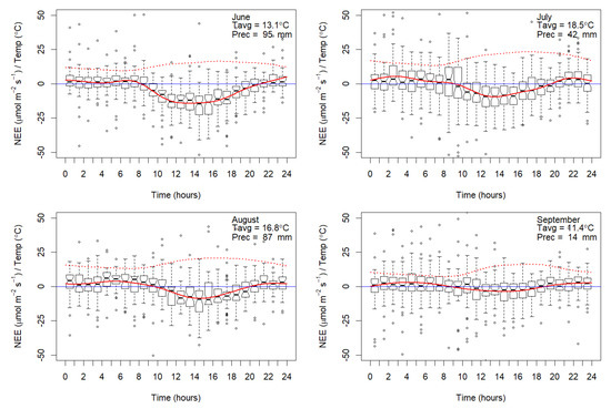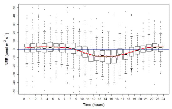 Values of net ecosystem exchange (NEE, µmol m−2 s−1) over the study period (June to September, 2014) on a 24-h timescale. Red line describes smooth mean of the NEE.