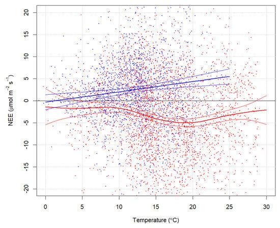 NEE (µmol m−2 s−1) and temperature (°C) over the study period (2014). Blue dots represent nighttime and red dots daytime eddy flux measurements. Lines represent GAM model predictions with confidence intervals.