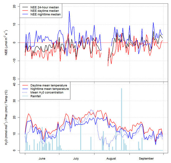 Carbon fluxes were sensitive to temperature and precipitation over the study period. Temperatures stayed above 0 °C and NEE balance was negative (−1.72 µmol m−2 s−1), indicating sink behavior (Figure 3). The beginning of June was cold and wet. Temperatures started rising later in the second half of the month. July was sunny and temperatures (average 18.5 °C) were the highest for the year. NEE showed higher uptake from the atmosphere in June. Fluxes acted as a C-sink between 08:00 and 21:00, between sunrise and sunset. C-uptake started in the mornings one hour after sunrise and respiration dominated in the nighttime one hour after sunset, similarly in every month.