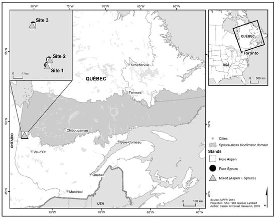 The studied sites (three in total) were between 2 and 15 km away from each other (Figure 1). We established three 20 × 50 m2 (0.1 ha) rectangular samples plots in each site, whereby each represented a stand which was uniform in terms of topography and vegetation. These comprised one pure (monodominant) stand of trembling aspen, one pure black spruce, and one mixed stand (Figure 1).