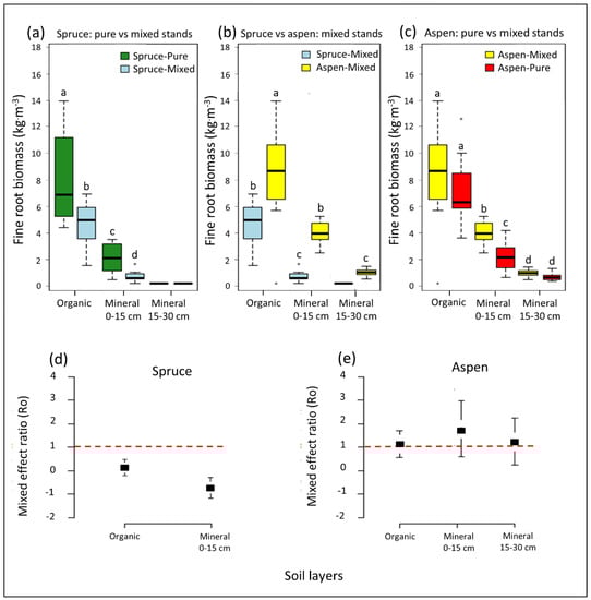 Differences in soil volume filling by fine roots of black spruce and trembling aspen in the three sampled soil horizon layers (a,c) between pure and mixed stands, and (b) within mixed stands. Species mixture effect on fine roots biomass of (d) black spruce and (e) trembling aspen in different soil horizon layers. In (a–c), the box represents 50% of the data set, distributed between the 2nd and 3rd quartiles. The median divides the box into the interquartile range. The lower and upper whiskers represent the minimum and maximum quartiles. For each soil layer, the number of samples n = 12 (i.e., 3 sites x 4 transects). Null values indicate that no root biomass was recorded in the soil layer on the transect. In (b), points represent average Ro values (n = 3), bars the 95% confidence interval, and the red dotted line the threshold under or over which the effect is considered as negative or positive. Statistical differences among pairwise comparison at p = 0.05 within each soil layer are denoted by letters.