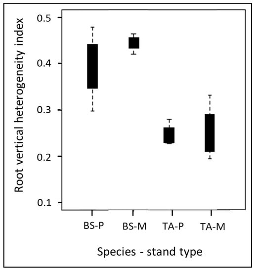 Fine roots vertical heterogeneity index describing how fully and evenly fine roots of black spruce (BS) and trembling aspen (TA) are distributed with soil depth in pure (P) and mixed (M) stands.