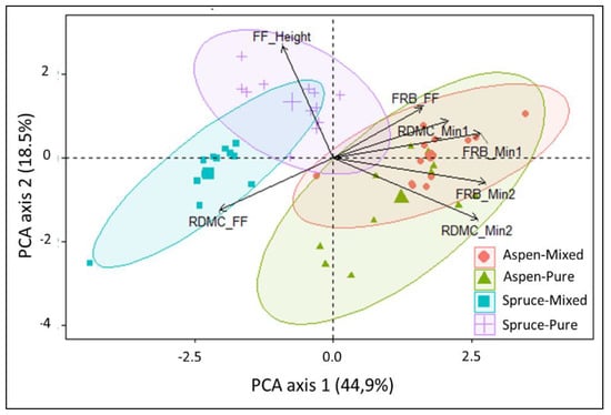 Principal component analysis of fine root biomass (FRB) and root dry matter content (RDMC) characterizing the rooting system of black spruce and trembling aspen in pure and mixed stands. The depth of organic horizon (FF_Height) was included in the analysis as a supplementary variable. FF, Min1, and Min2 refer to organic, mineral soil at 0–15 cm, and mineral soil at 15–30 cm, respectively.