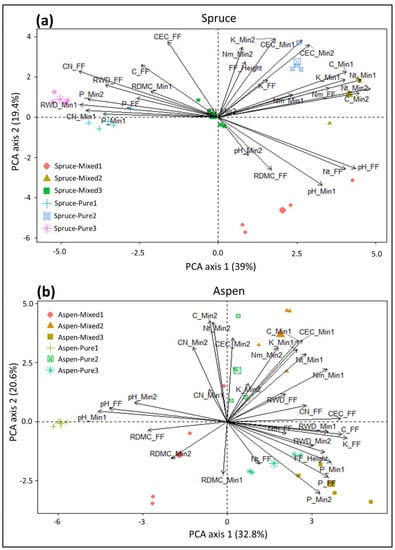 Principal component analysis comparing rooting patterns of black spruce (a) and trembling aspen (b) between pure and mixed stands. Variables included in the analyses are C:N ratio, pH, total carbon (C), total nitrogen (Nt), Ammonium (Nm), phosphorus (P), potassium (K), exchangeable cations (CEC) and depth of the organic layer (FF height), fine root biomass (FRB), and root dry matter content (RDMC) of the two species in respective pure and mixed stands affected by site (1–3). FF, Min1, and Min2 refer to organic, mineral soil at 0–15 cm, and mineral soil at 15–30 cm, respectively.