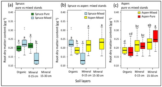 Differences in the root dry matter content (RDMC) of fine roots of black spruce and trembling aspen in the three sampled soil horizon layers (a,c) between pure and mixed stands, and (b) within mixed stands. The box represents 50% of the data set, distributed between the 2nd and 3rd quartiles. The median divides the box into the interquartile range. The lower and upper whiskers represent the minimum and maximum quartiles. Statistical differences among pairwise comparison at p = 0.05 within each soil layer are denoted by letters.