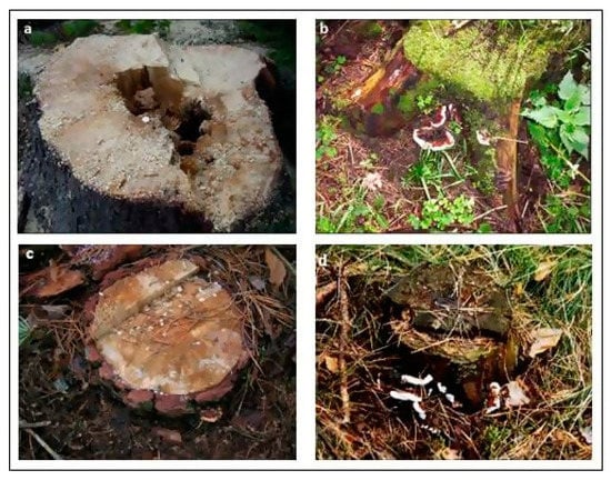 - Kubiak, K.; Damszel, M.; Sikora, K.; Przemieniecki, S.; Małecka, M.; Sierota, Z. Colonization of fungi and bacteria in stumps and roots of Scots pine after thinning and treatment with Rotstop. J. Phytopathol. 2016. [Google Scholar] [CrossRef]