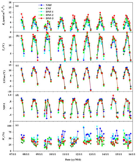 Similar to the seasonal variations of Ts and NDVI, Rs showed an obvious seasonal pattern during the study period (Figure 1). The maximum Rs usually appeared at the mid-growing season and corresponded to the maximum Ts and NDVI values, except for one in July of 2009, which corresponded to the lowest Ws recorded during the whole experiment period (Figure 1). One-way ANOVA result illustrated that among the five sites, DNF-3 exhibited the highest Rs, DNF-1 showed the least Rs, and the difference of the average Rs varied among the sites (Table 3).