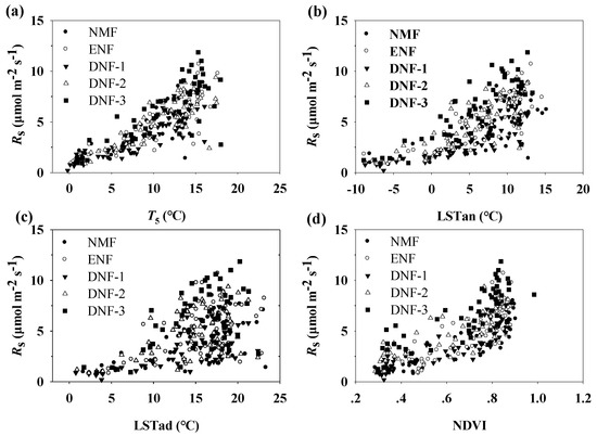Correlations between soil respiration (Rs, μmol CO2 m−2 s−1) and (a) soil temperature at the 5 cm depth (T5, °C), (b) nighttime land surface temperature from Aqua MODIS (LSTan, °C), (c) daytime land surface temperature from Aqua MODIS (LSTad, °C), and (d) normalized difference vegetation index (NDVI) during the measurement.