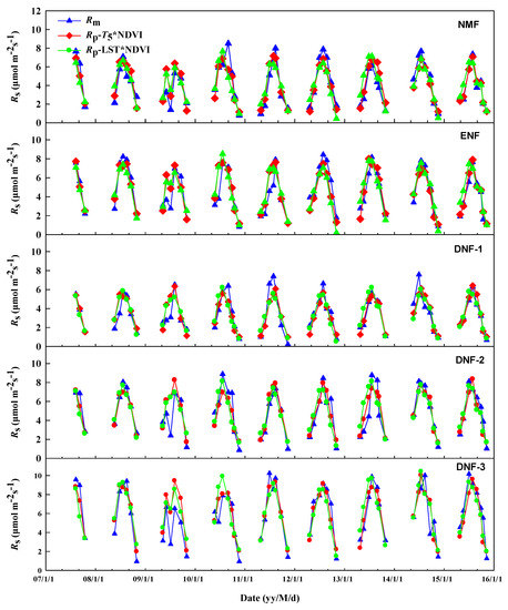 Our result is consistent with previous studies [19,20,27]. For example, in a Canadian boreal black spruce stand, Wu et al. [20] reported that nighttime LST showed a greater potential in explaining variations in Rs than daytime LST, referring to the fact that nighttime LST is more resistant to various residual noise components. Huang et al. [19] suggests that an accurate estimation of Rs could be inferred with Terra MODIS LST using either nighttime LST or the mean of daytime and nighttime LST as the independent variable in regression equations.