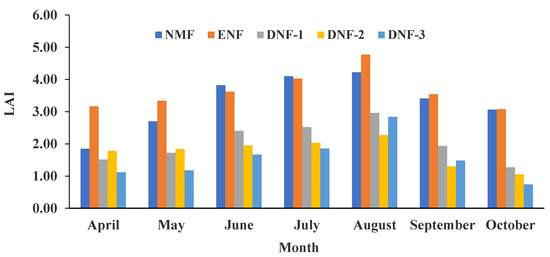 The seasonal variations of leaf area index (LAI) from April to October 2015.