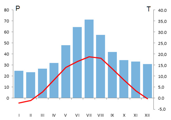 According to Kottek et al. [28], the study site is located within the Cfb Köppen–Geiger climate zone. The mean annual temperature in the period 1971–2016 equalled 8.4 °C, while the mean temperature in the vegetation season of April–September amounted to 15.0 °C. The average annual precipitation was rather low, reaching merely 487 mm, with 314 mm (i.e., 65% of annual amount) in April–September (Figure 1).