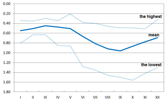 Highest, mean, and the lowest monthly averages of the groundwater level (meters below ground) at the Sieraków site in 1999–2016.