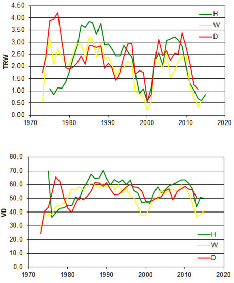 Relationship between TRW (mm) or tree-ring index TRI (dimensionless) and VD (μm) for healthy (H), weakened (W) and dead (D) alders from Sieraków.