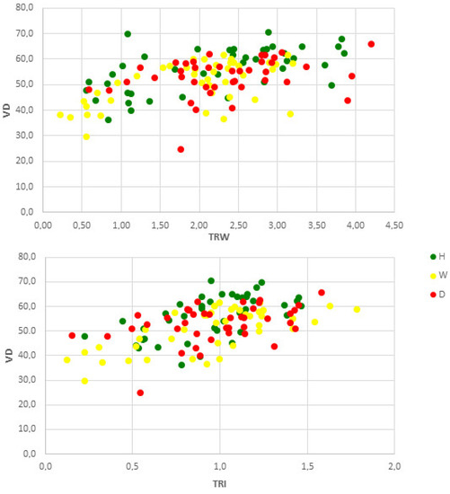 For the investigated alders, VD was significantly positively related to TRW and TRI (Figure 5). The higher correlation coefficient value was found for the latter parameter, indicating a slight influence of tree age on the observed relationship (rTRW = 0.513, p < 0.001 vs. rTRI = 0.550, p < 0.001). Health status also affected these relations, since for the dead trees, we found much lower correlation coefficients (rTRW = 0.290, p = 0.066 vs. rTRI = 0.404, p = 0.009) compared to the healthy (rTRW = 0.593, p < 0.001 vs. rTRI = 0.581, p < 0.001) and weakened trees (rTRW = 0.683, p < 0.001 vs. rTRI = 0.404, p < 0.001).