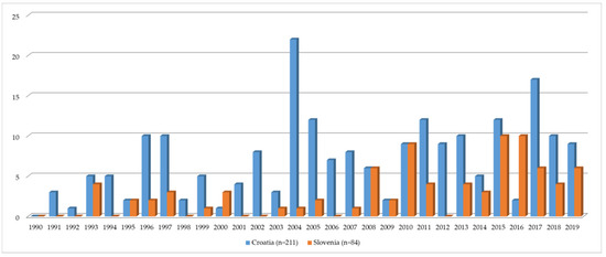Distribution of publications in Croatia and Slovenia per year.