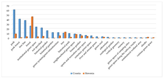 We were also interested to see how many times publications addressed a certain type of green space. The results showed big differences between Croatia and Slovenia (Figure 6). For instance, Croatian publications showed greater variation of green space addressed in those publications. We identified altogether 24 types of green space. In comparison, Slovenian publications showed less variation with only 14 types of green space. The most frequent type of green space in publications of Croatian authors was parks (with or without adding historical parks into account), followed by park-forests, tree lines and urban forests. On the other hand, in Slovenian publications urban forest was conspicuously the most frequent type of green space.
