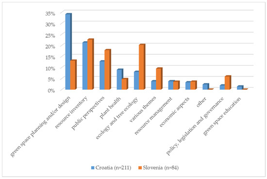 Another point of investigation was the analysis of publication themes (Figure 7). The most frequent themes in Croatia were green space planning and/or design, resource inventory, public perspectives, plant health, as well as ecology and tree ecology, while in Slovenia the same themes gained prominence, but in a different order. The only exception is the theme of plant health, which gained only marginal interest among Slovenian authors.