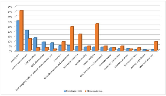 Finally, we took closer look into methods used in research publications (research papers, preliminary communications, dissertations and scientific master’s theses). The majority of publications in both countries used some form of field work (in Croatia 44.1% of publications, while in Slovenia 52.9%) (Figure 8). By field work we mean measurements, inventories, assessments or observations on the natural resource, so we did not include on site face-to-face interviews, even though these are also implemented in the field. The second most frequent method in both countries was a description or a narrative (30.9% in Croatia and 40.9%). In Croatia, this is mostly due to one third of research publications being review papers (39 out of 116). The survey questionnaire as a method was in third place in Croatia (20.7% of publications), while in Slovenia it was spatial analysis (27.3%).