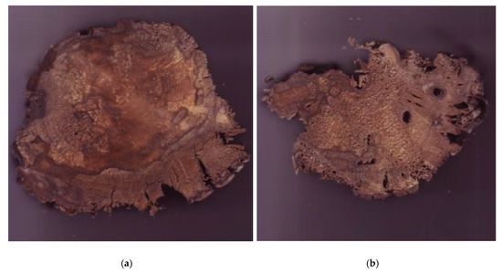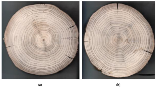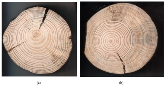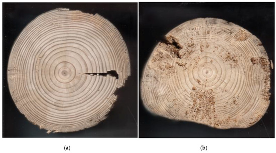 Cross-sections of typical pine wood samples taken from the forest road of the Koło Forest Inspectorate: (a) from section KRW1 of Rogóźno Forest District—sample So1-KRW1, (b) from section KLG2 of Lipie Góry Forest District—sample no. So1-KLG2.