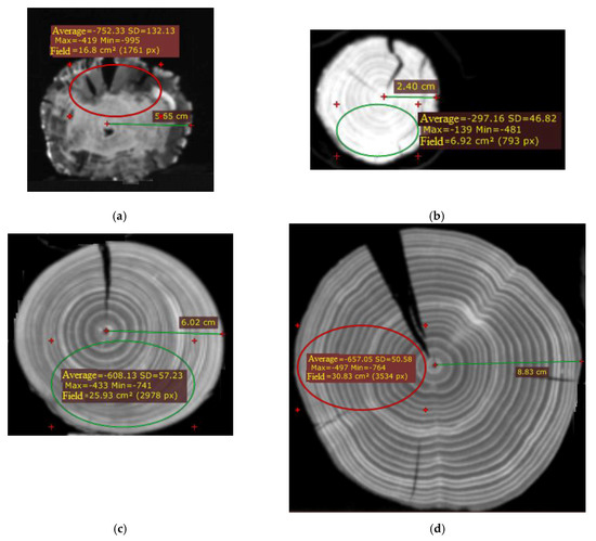 Within a pilot trial, the possibility of using X-ray computed tomography to reach conclusions on the state of the preservation of wood from forest road substrates was tested. Examples of the reconstructions of cross-sectional images of wood are shown in Figure 6. The brighter areas correspond to higher material density, e.g., latewood zones, and the darker areas to lower density, e.g., earlywood zones. These images can be used to read, among other things, annual growth patterns and, more importantly, the Hounsfield scale density for any area. After using the Hounsfield density scale on the reference samples, the results were converted to actual densities in kg/m3, which confirmed the previous findings. The resulting images provide information, among others, about the size and arrangement of wood defects. For example, “blurred” annual growth increments and darker areas are zones of wood damaged by decay.