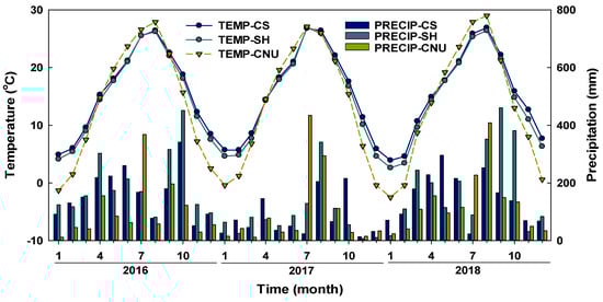 Monthly temperature and precipitation at Cheongsu (CS) and Seonheul (SH) Gotjawal in Jeju Island and Chungnam National University (CNU) Experimental Forest in Daejeon from 2016 to 2018.