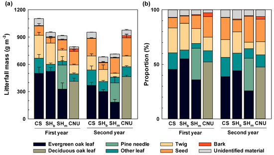 Annual litterfall (a) mass and (b) proportion of each litter component in evergreen broadleaved forest at Cheongsu (CS), evergreen broadleaved forest at Seonheul (SHb), mixed forest at Seonheul (SHm), and deciduous broadleaved forest at Chungnam National University (CNU) from August 2016 to August 2018. First and second year indicate the period from August 19, 2016 to August 23, 2017 and from August 24, 2017 to August 21, 2018, respectively. Evergreen oak leaf includes Quercus glauca and Q. salicina in CS, SHb, and SHm. Pine needle in SHm represents needle litter of Pinus thunbergii. Deciduous oak leaf in CNU represents leaf litter of Q. acutissima.