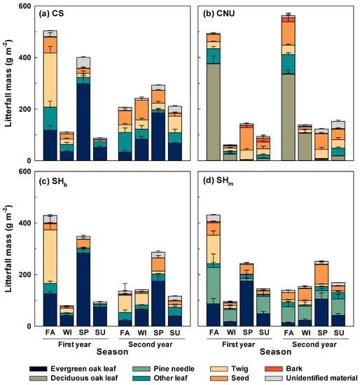 Seasonal variation of litterfall mass in (a) evergreen broadleaved forest at Cheongsu (CS), (b) deciduous broadleaved forest at Chungnam National University (CNU), (c) evergreen broadleaved forest at Seonheul (SHb), and (d) mixed forest at Seonheul (SHm) from August 2016 to August 2018. FA, WI, SP, and SU indicate the seasons of fall, winter, spring, and summer, respectively. First and second year indicate the period from August 19, 2016 to August 23, 2017 and from August 24, 2017 to August 21, 2018, respectively. Evergreen oak leaf includes Quercus glauca and Q. salicina in CS, SHb, and SHm. Pine needle in SHm represents needle litter of Pinus thunbergii. Deciduous oak leaf in CNU represents leaf litter of Q. acutissima.