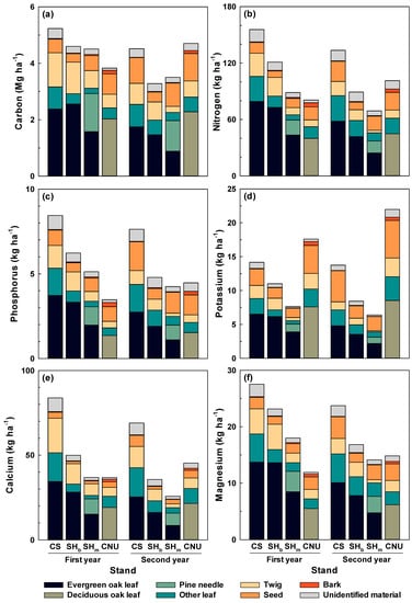 Annual (a) carbon, (b) nitrogen, (c) phosphorus, (d) potassium, (e) calcium, and (f) magnesium content of litterfall in evergreen broadleaved forest at Cheongsu (CS), evergreen broadleaved forest at Seonheul (SHb), mixed forest at Seonheul (SHm), and deciduous broadleaved forest at Chungnam National University (CNU) from August 2016 to August 2018. First and second year indicate the period from August 19, 2016 to August 23, 2017 and from August 24, 2017 to August 21, 2018, respectively. Evergreen oak leaf includes Quercus glauca and Q. salicina in CS, SHb, and SHm. Pine needle in SHm represents needle litter of Pinus thunbergii. Deciduous oak leaf in CNU represents leaf litter of Q. acutissima.