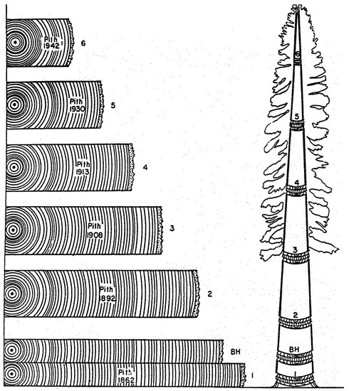 Echoes of Leonardo’s hypothesis that foreshadowed the pipe model theory had emerged in the mid-nineteenth century, and are referred to as ‘Pressler’s laws’ [46]. One of them, in particular, states that “Ring area growth (cross-sectional area of a single annual increment) at any one point on the stem is proportional to the quantity of foliage above this point” (Pressler 1864 as cited by [46], p. 2). This hypothesis sparked a lively controversy between Pressler and other scientists of his time, involving the way in which radial increment (ring width, ring area, or ring volume) was measured. The distribution of annual growth along the tree stem determines its form, or taper, and Larson [46] outlined potential mechanisms, from nutritional to hydraulic, and from mechanical to hormonal, that could control the allocation of new photosynthate to different tree organs. An effective way to test Pressler’s ‘law’ and similar hypotheses is through stem analysis [47,48], the subject of Figure 1. And in case the reader has not yet found all the dating error(s) in that figure, its corrected version is presented in Figure 4. Tree rings were incorrectly dated in the original cartoon.
