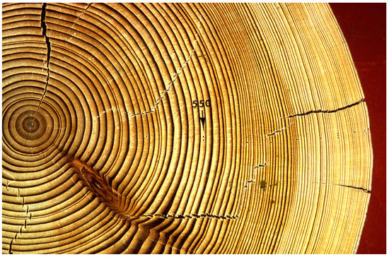 The stem cross-section known as MLK, an acronym derived from the collector’s (Earl H. Morris) last name initial and the field site (Lukachukai Mountains, within the Navajo Nation in northeast Arizona, USA). It is a Douglas-fir (or PSME, shorthand for Pseudotsuga menziesii (Mirb.) Franco) specimen uncovered from the archaeological excavation of Broken Flute Cave (photo © Laboratory of Tree-Ring Research, Tucson, Arizona; courtesy of Rex Adams). Being an archaeological specimen, there is no bark left on the outside; only the wood remains. The shape of the rings is nearly circular, with yellow-colored earlywood and brown-colored latewood forming each annual growth increment. Year 550 is clearly indicated by an arrow pointing at the conventional two-dot symbol, which is used to mark the half-century year. Other visible single-dot symbols mark each decade, and a three-dot symbol marks the century, year 600 in this case. By a twist of chance, calendar decades on this specimen happen to correspond to cambial decades, so for instance year 550 occurs at the cambial age of 30 years. A change in overall color occurs around year 580, from darker (inside; ~55–60 rings) to lighter (outside; ~45–40 rings). Within the overall trend from wider inner rings to narrower outer ones, there are easy-to-spot ‘pointer’ years [34], i.e., 526, 536, and 543. One of these relatively sudden, single-year growth decreases, year 536, is in common with many other trees and sites, possibly because of a global climatic anomaly caused by one or more major volcanic eruptions [35] or by a comet impact [36]. As one would expect, these hypotheses are quite contentious.