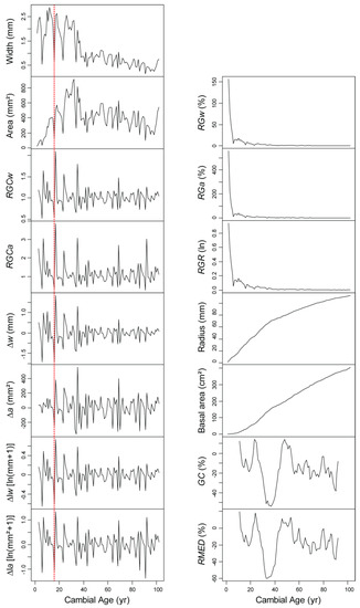 Cumulated rings widths and ring areas subtly portrayed the slower increase over time of basal area compared to stem radius at low cambial ages (<40 years), followed by a reversal as time passed and the stem enlarged (Figure 3). As the trunk expands, its slowly shrinking one-dimensional increments can still translate into not-so-decreasing two-dimensional growth rates. Percentage growth changes (GC and RMED) changed more slowly, i.e., at interdecadal time scales rather than interannual ones, with little difference in fluctuations between running means (GC) or medians (RMED). A growth reduction greater than 50% was calculated for cambial ages 32–33, although visually (from Figure 2) one would have expected the timing to be a few years later (37–38). Running means or medians applied to time-series data can be viewed as linear filters that provide a form of smoothing [40], but their properties, and the way in which peaks, dips, and periodicities differ between the original and the transformed time series, require careful consideration [41,42].