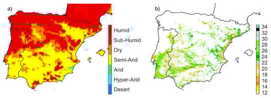 Due to the increasing trends observed in evapotranspiration in the Iberian Peninsula [19,20], it is likely that the aridity index depends on the period considered, but with negligible impact on the present assessment. Moreover, the spatial resolution of the WRF dataset is advantageous, since precipitation is very sensitive to topography. Precipitation and evapotranspiration were available with a Lambert projection, but the aridity index was resampled to match the NDVI sinusoidal projection, using a bilinear interpolation. The results were then grouped in seven aridity classes, following Spinoni et al. (2015) [49], namely humid, sub-humid, dry, semi-arid, arid, hyper-arid, and desert, as shown in Figure 1a.