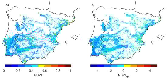 (a) Normalized Difference Vegetation Index (NDVI) observed in June 2005 and (b) NDVIstd values in June 2005.